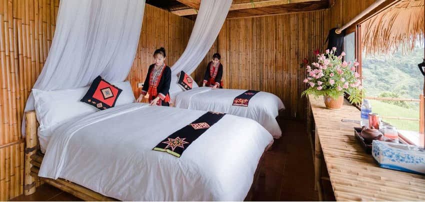 12 bungalows sont tout de bambous, de bois vêtus et coiffés de chaume, situés sur une crête de montagne offrant un panorama à couper le souffle sur les rizières en terrasse qui ont fait la réputation de cette superbe région.